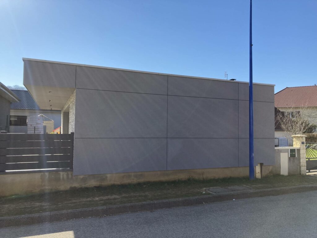 Réalisation d’un bardage de marque Eternit Equitone sur un garage à Autechaux. Un produit en fibrociment moderne qui se marie à merveille avec la pierre de parements que nous avons posés sur la face avant du garage.